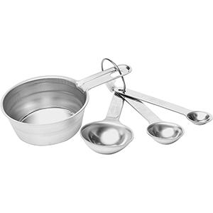 Набор мерных ложек для кухни из нержавеющей стали. 4 предмета: 1/4 чайной ложки (1,25 мл), 1 чайная ложка (5 мл), 1 ст ложка (15 мл) и 1 чашка (100 мл).Content for class "cl" Goes Here