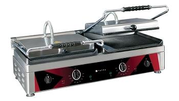 Контактный гриль TATRA TCG 3627 RR RS предназначен для использования на предприятиях общественного питания и торговли для разогрева блюд из мяса, птицы и овощей, а также приготовления горячих бутербродов и сэндвичей. Данная модель оснащена двумя зонами нагрева с независимым управлением. 1 зона: рифленые верхняя и нижняя поверхности. 2 зона: рифленые верхняя и гладкая нижняя поверхности. Рабочие поверхности размером 360х270 мм выполнены из чугуна. Корпус изготовлен из нержавеющей стали. Емкость для сбора жира предотвращает загрязнение рабочего места. Контактный гриль оснащен электромеханической панелью управления с выключателем питания, терморегулятором и индикаторами питания и нагрева. Температурный диапазон оборудования 50-300 C. Оптимальная температура использования 200-250 C. Время разогрева до рабочей температуры составляет около 15 минут.Content for class "cl" Goes Here