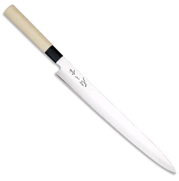 Нож для нарекзи "Sashimi" 30 см., нерж. сталь, ручка пластик Профессиональные кухонные ножи изготавливаются на территории Тайваня под техническим надзором японской компании. Лезвия ножей изготавливаются из высокоуглеродистой кованной немецкой стали марки 1.4116 X50CrMoV15, которая приобретается исключительно в Германии. Оптимально подобранный состав легированного сплава, после соответствующей термической обработки позволяет обеспечить твердость режущей кромки длительное время. В лезвии ножа сочетаются отличные режущие свойства, высокая прочность и стойкость к коррозии. Заводская заточка режущей кромки осуществляется под определенным углом, что примерно в три раз увеличивает износостойкость лезвия - нож не требует частого затачивания и долго остается острым.Content for class "cl" Goes Here