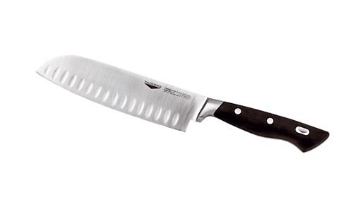 Нож для японской кухни 18 см. с углубленииями, кованый Профессиональный нож из кованной нержавеющей стали, высокая защита от коррозии. Эргономическая и симметричная ручка сделана из дорогостоящего материала, имеющая высокую сопротивляемость к удару и перемене температуры, все использованные материалы нетоксичны, соответствуют европейским стандартам.Content for class "cl" Goes Here