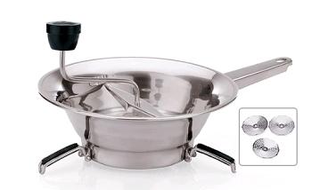 Терка механическая для протирания овощей, варенных продуктов, с ручным приводом, тремя взаимозаменяемыми вставками - сито и раскладными ножками. Три сетки диаметром 1,5, 2,5 и 4 ммАксессуары